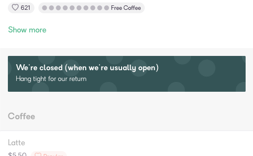 Store hours are set for each day of the week via your Skip Business Account and where also upcoming known changes to your store's operating hours can be pre-planned, but when you have an extended closure period or need to close your store during normal trading hours, the extended closure function can be used make this known to your customers and to avoid orders being received when you are unable to fulfil them.